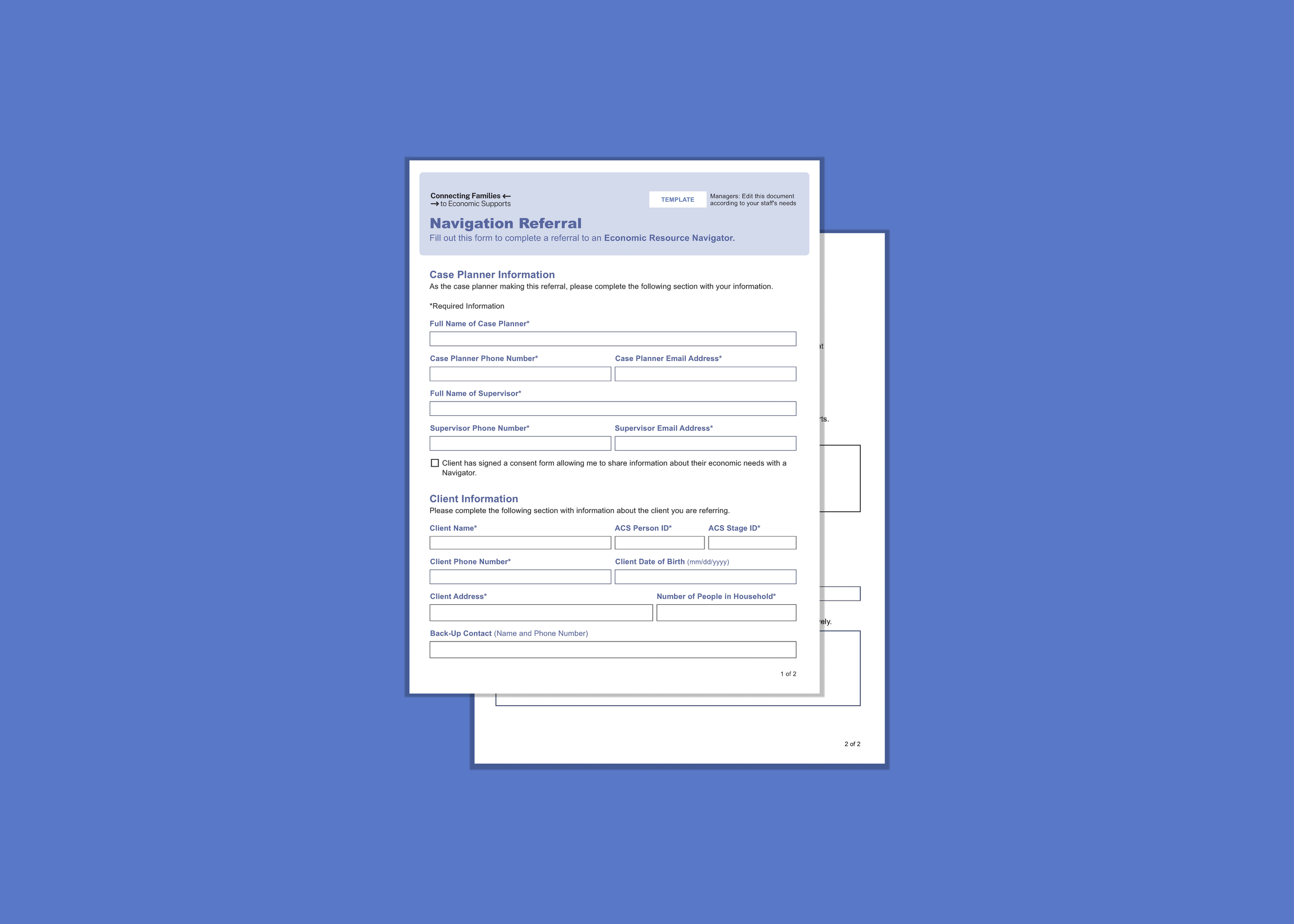 The referral includes Case Planner information, client Information, referral context and client needs. It is designed to be emailed by the Case Planner to a Navigation Provider as an encrypted PDF.