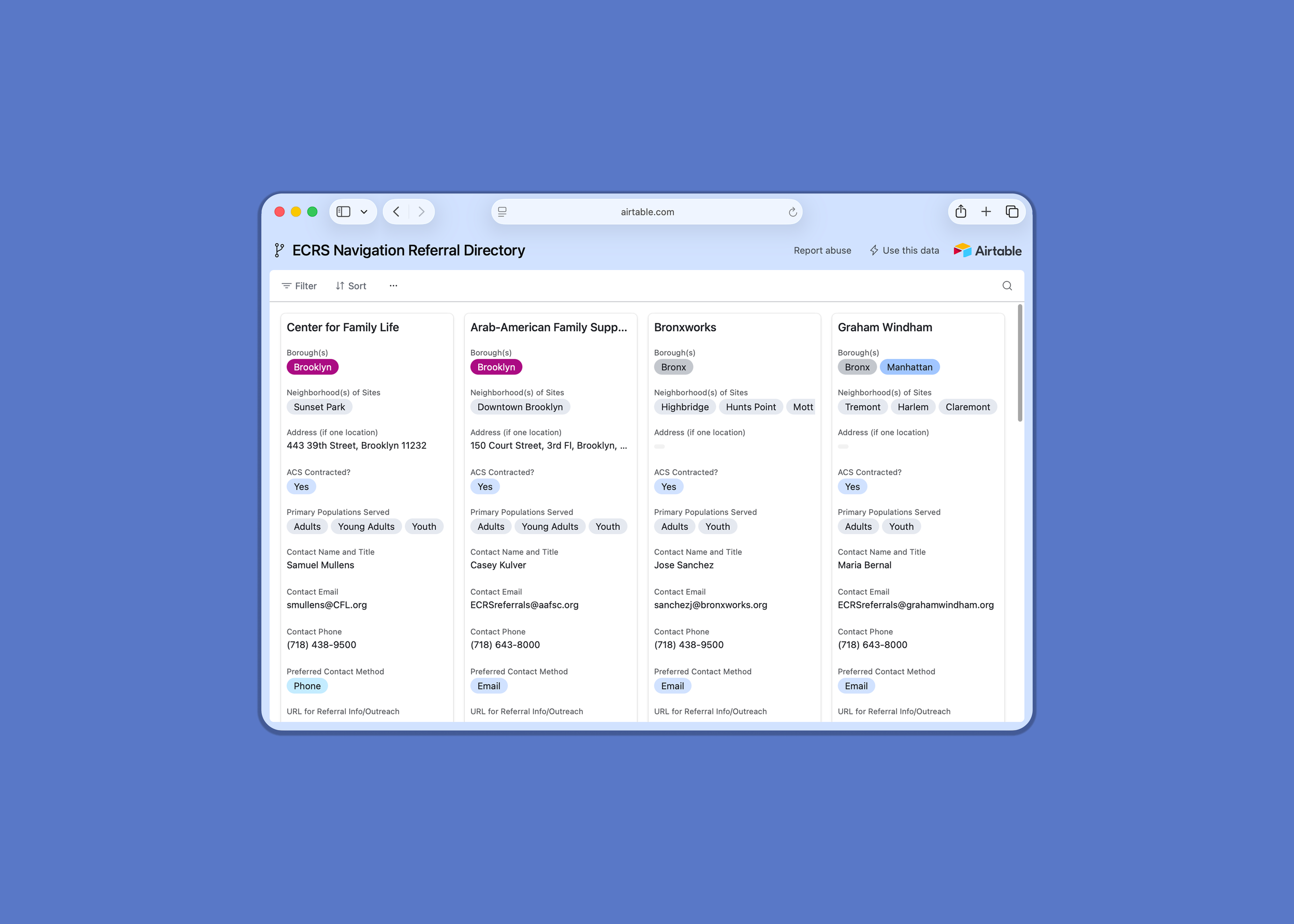 The directory lists community-based organizations that can receive navigation referrals and the appropriate contact at each organization. It can be sorted and filtered by location, populations served, programs offered in-house, language accessibility, and cultural competence.